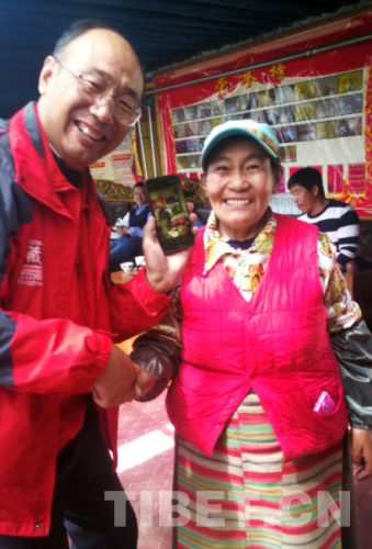 圖為(wei) 唐召明向次仁朗加展示其手機裏有關(guan) 她的照片(唐召明提供,2019年9月20日攝)