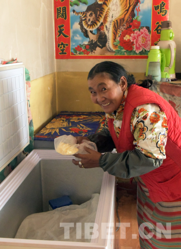 圖為(wei) 次仁朗加在新的安居房裏,使用冰櫃冷藏酥油與(yu) 牛羊肉(唐召明2019年9月20日攝)