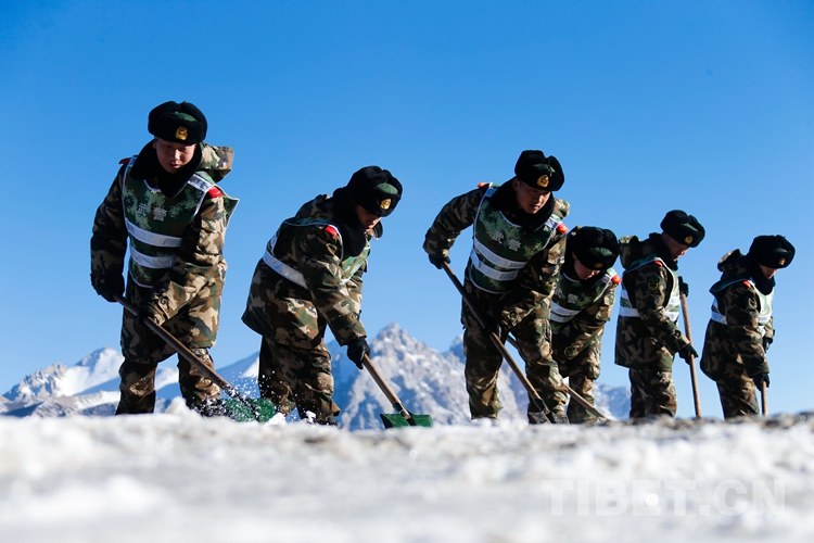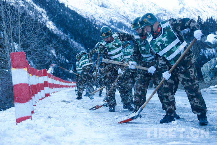 圖為(wei) 官兵在川藏線然烏(wu) 湖段清理路麵積雪結冰