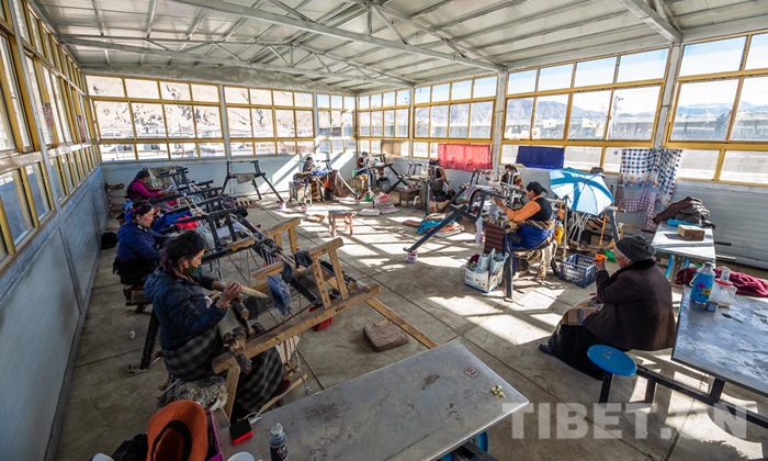 沐浴著陽光,措姆在合作社二樓的陽光房內(nei) 編織著氆氌。今年68歲的她是合作社裏的老員工了,2010年合作社剛成立時措姆就加入了合作社,一直工作至今。