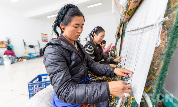2010年,在了解了合作社的政策、效益和經營情況之後,措姆毅然加入了合作社,最起碼編織氆氌的原材料不用自己花錢了。合作社采用“支部+合作社+農(nong) 戶”的運行模式,編織氆氌和卡墊的場地、原材料由合作社提供,銷售一件氆氌製作的邦典合作社抽成10元,卡墊抽成50元,剩下的錢全部歸織工所有。