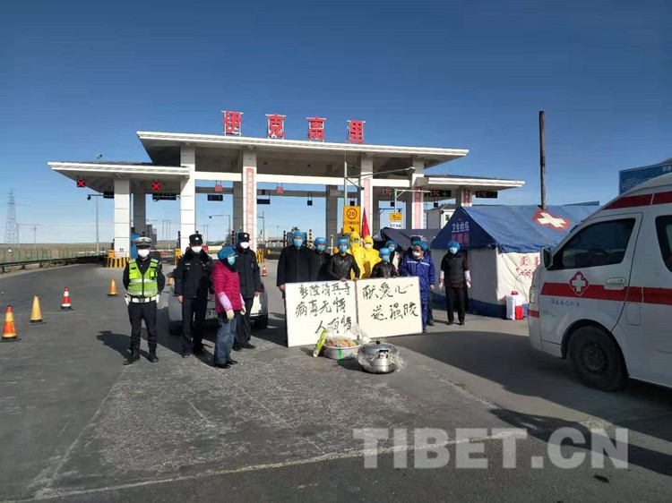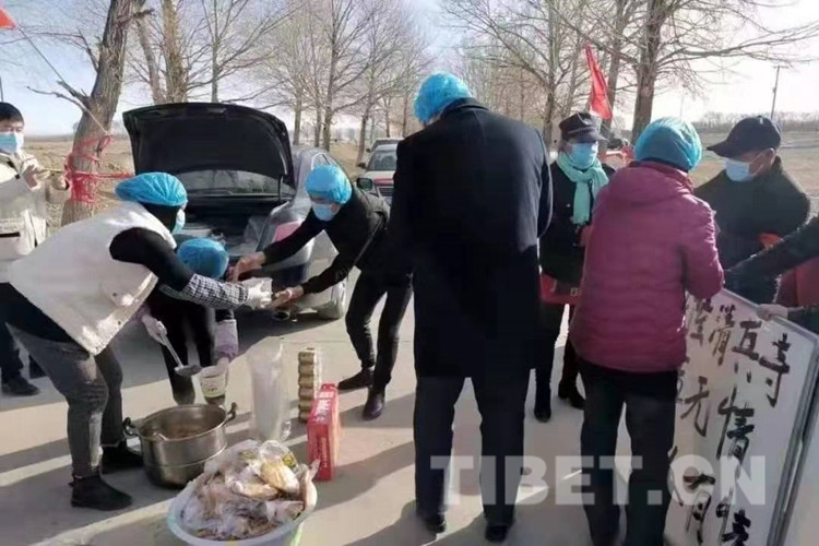 圖為(wei) 都蘭(lan) 縣香日德班禪寺院民管會(hui) 帶領部分僧人和香日德班禪慈善醫院醫務人員為(wei) 執勤民警和工作人員發放慰問品和醫療防護用品