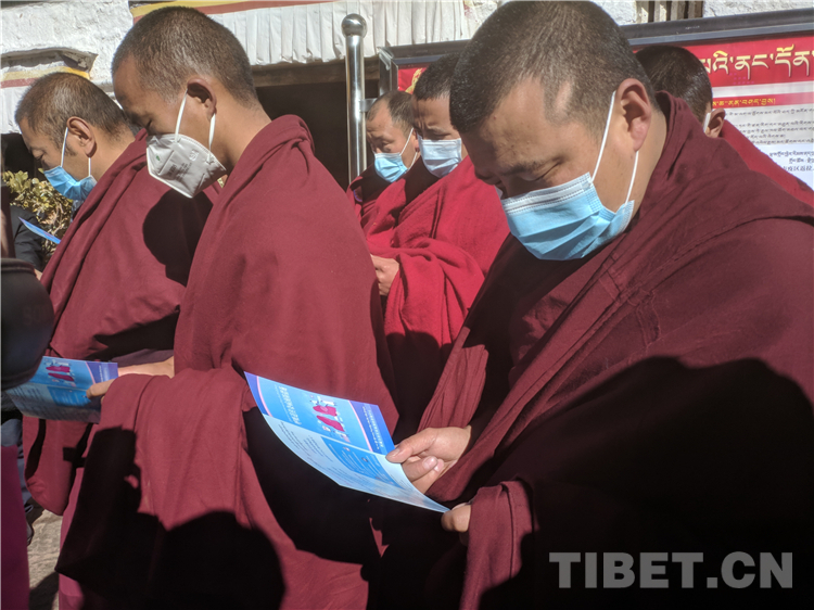 圖為(wei) 拉薩大昭寺僧人認真閱讀疫情防控宣傳(chuan) 資料 攝影:唐啟勝
