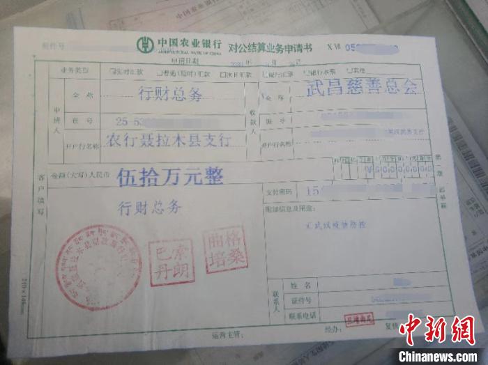 圖為(wei) 聶拉木縣向武昌區捐款憑證