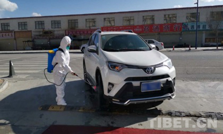 圖為(wei) 消殺組工作人員正在對進醫院的車輛消毒 圖片由西藏自治區第三人民醫院提供