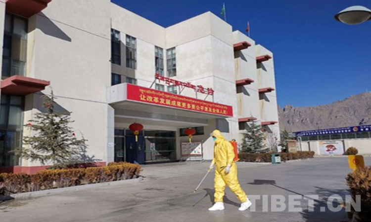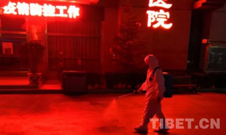 圖為(wei) 消殺組工作人員正在對醫院進行消毒 圖片由西藏自治區第三人民醫院提供