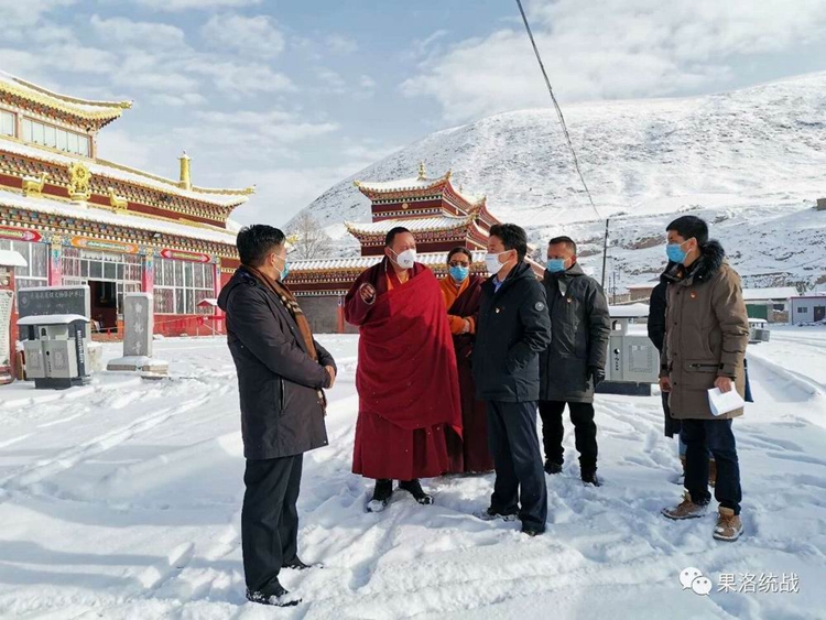 圖為(wei) 青海省委常委、統戰部部長公保紮西(前左三)在果洛州委書(shu) 記武玉嶂(前左二)陪同下在瑪沁縣拉加寺調研督導疫情防控工作