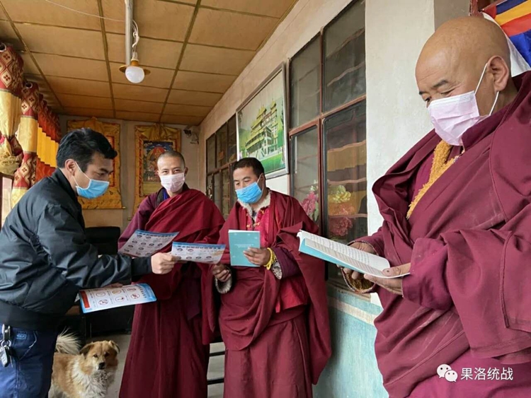 圖為(wei) 果洛州駐寺幹部為(wei) 僧人送去新冠肺炎防疫防護書(shu) 籍