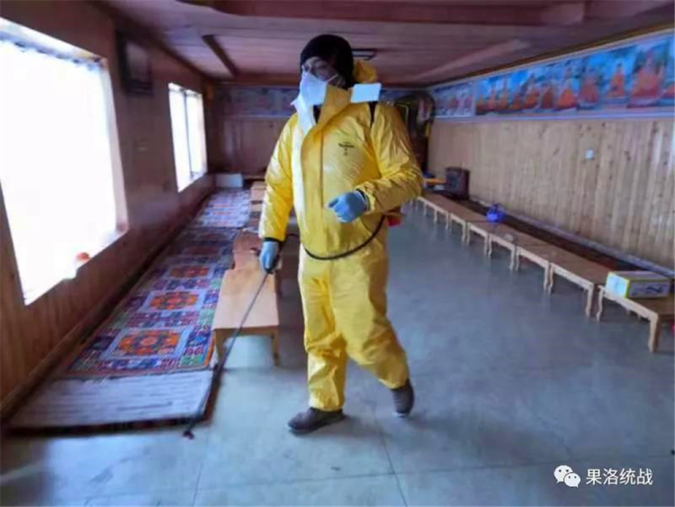 圖為(wei) 果洛藏族自治州內(nei) 寺廟正在進行消毒圖片來源:果洛統戰公眾(zhong) 號