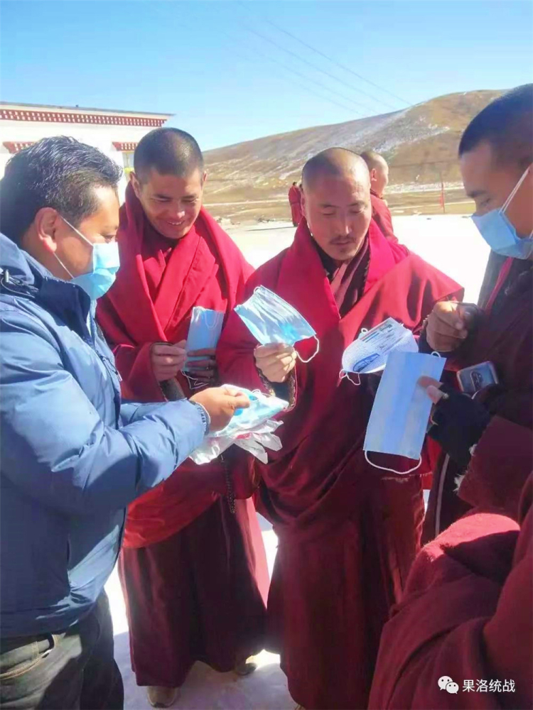 圖為(wei) 果洛藏族自治州州委統戰部為(wei) 寺廟僧人送去口罩 圖片來源:果洛統戰公眾(zhong) 號