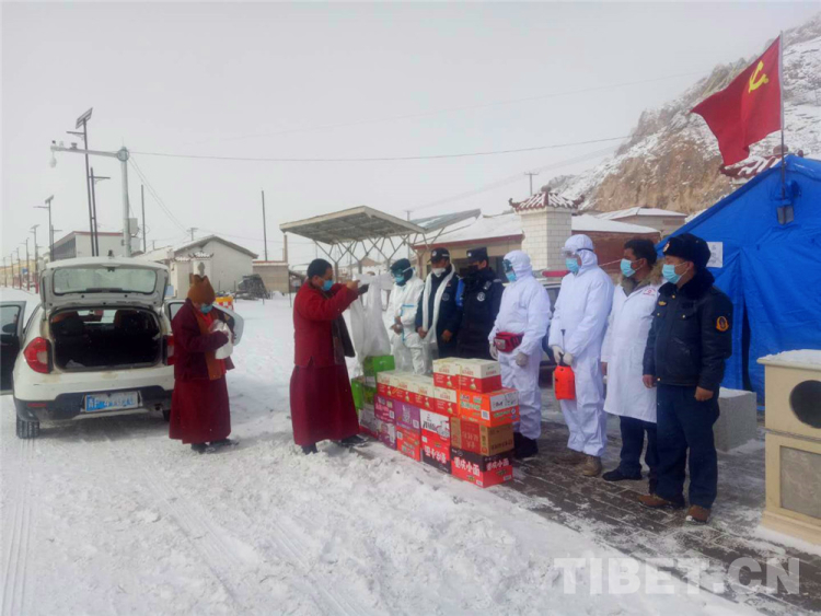 圖為(wei) 瑪多縣曲那邁寺僧人為(wei) 防控一線工作者捐獻物品 圖片來源:瑪多縣統戰部