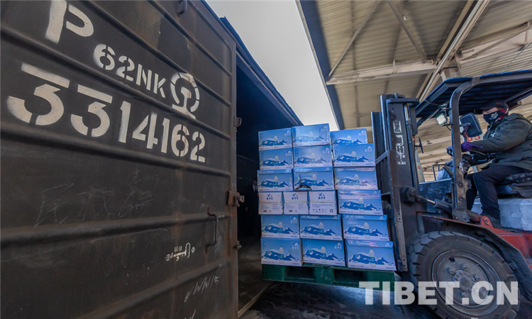圖為(wei) 西藏籌集價(jia) 值850萬(wan) 元的天然飲用水和犛牛肉裝載列車馳援湖北。攝影:趙耀