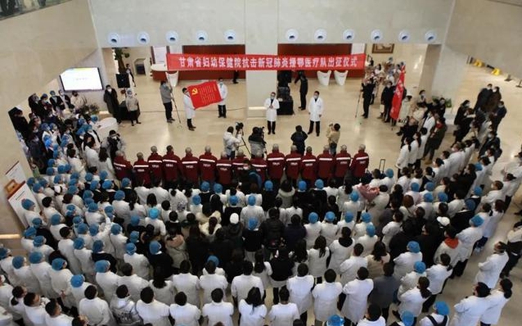 圖為(wei) 2020年2月15日,甘肅省婦幼保健院援助湖北醫療隊15名隊員火速到位,與(yu) 來自全國各地的白衣戰士迅速集結,加入武漢戰“疫”總攻