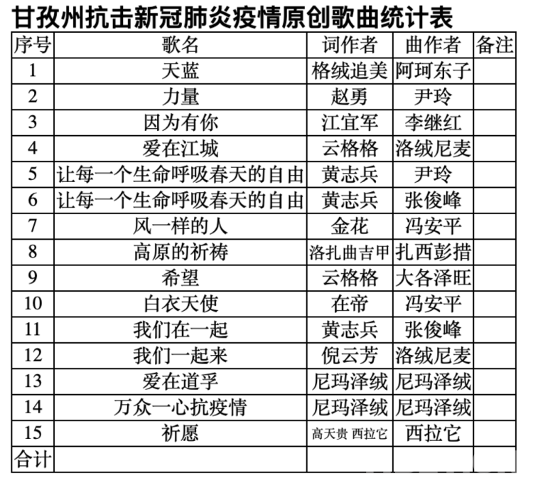 圖為(wei) 甘孜州抗擊新冠肺炎疫情原創歌曲列表
