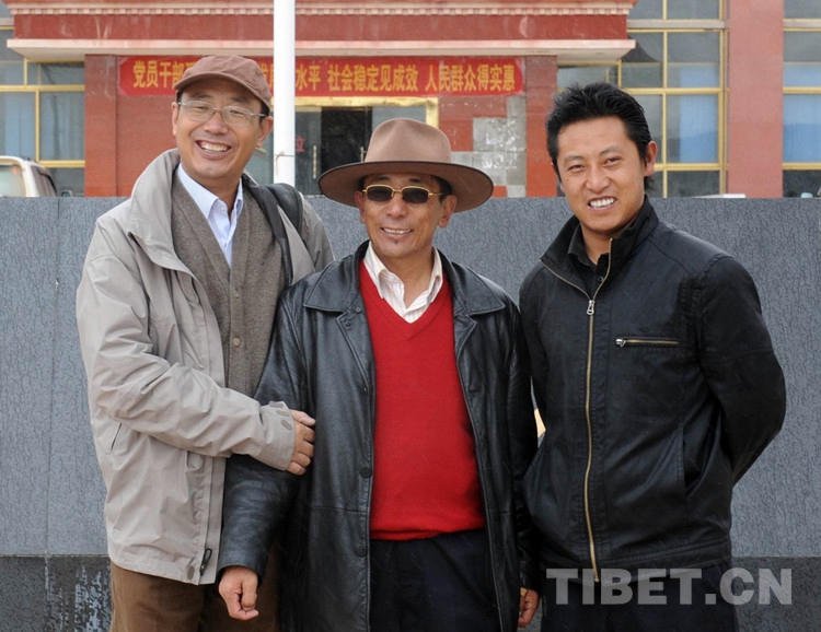 這是唐召明(左)與(yu) 時任西藏自治區雙湖特別區區委書(shu) 記珠巨(中)在辦公樓前合影留念。(唐召明提供,2009年7月29日攝)