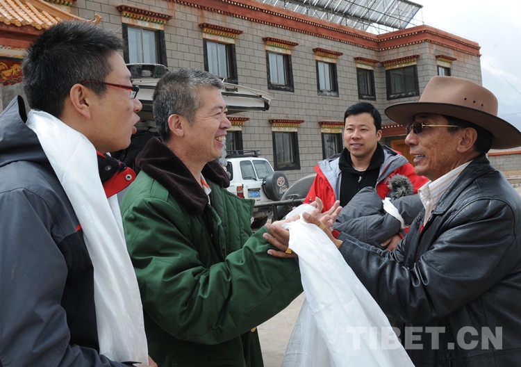 這是時任雙湖特別區區委書(shu) 記珠巨(右)在向來視察工作的中石油領導幹部敬獻哈達。(唐召明2009年7月29日攝)