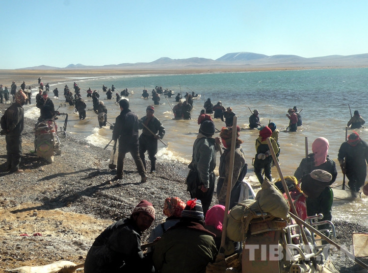 這是雙湖特別區群眾(zhong) 在湖裏捕撈鹵蟲卵。(唐召明提供,2009年攝)