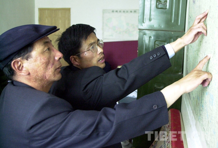 這是時任雙湖特別區副區長珠巨(左)與(yu) 區委書(shu) 記範科創(右)在研究牧業(ye) 發展情況。(唐召明2001年6月20日攝)
