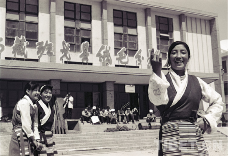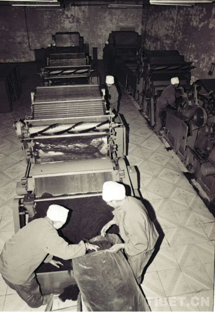 圖為(wei) 過去手拿牧鞭的牧女格桑措姆(左四)和夥(huo) 伴次仁央金(左三)、央金卓嘎(左一)、梅朵娜珍(右一)等在一起分享勞動成果的優(you) 質無毛絨。她們(men) 是該廠的生產(chan) 能手,並被評為(wei) 廠先進工作者(唐召明1994年5月2日攝)