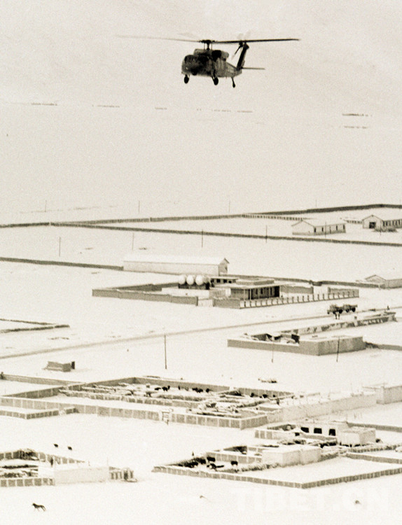 這是“黑鷹”直升飛機從(cong) 拉薩飛臨(lin) 藏北災區。(唐召明1990年3月26日攝)