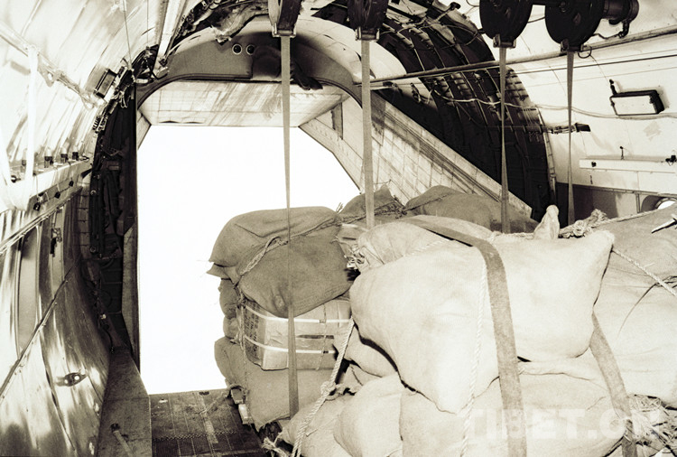 這是來西藏執行抗災救援任務的大型運輸機安-12正在空投糧食和衣物。(唐召明攝於(yu) 1990年3月23日)