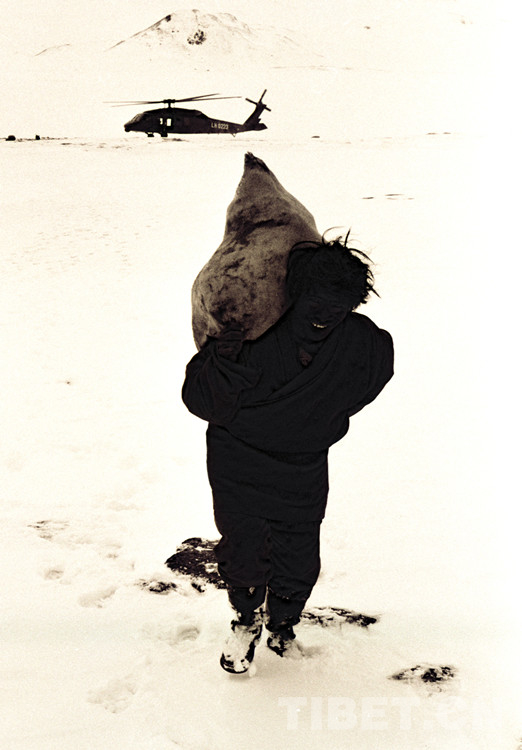 兩(liang) 架“黑鷹”直升飛機從(cong) 拉薩飛赴災區後,先在那曲鎮草壩上作短暫停留,我和機組人員一同聽取時任那曲地委書(shu) 記李光文關(guan) 於(yu) 災情的介紹:“這次我們(men) 那曲地區的雪災麵積達24萬(wan) 平方公裏,包括了巴青、比如、嘉黎、索縣、那曲、聶榮等8個(ge) 縣的113個(ge) 鄉(xiang) ,22萬(wan) 多人口,其中特重災鄉(xiang) 、重災鄉(xiang) 的麵積達到10萬(wan) 平方公裏。”