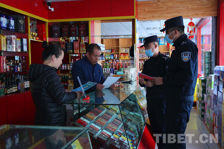 圖為(wei) 吉隆出入境邊防檢查站移民管理警察為(wei) 駐地吉隆鎮商戶宣講國家安全常識,講明國家安全是大事,關(guan) 乎每個(ge) 人的切身利益,作為(wei) 生意人要遵守商道規則,維護消費者合法權益等。 攝影:肖富貴