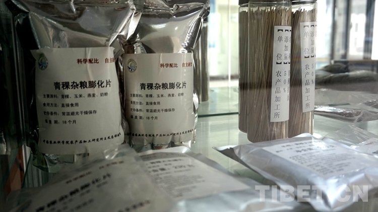 圖為(wei) 西藏自治區農(nong) 牧科學院農(nong) 產(chan) 品開發與(yu) 食品科學研究所一樓展示區裏展示的青稞係列產(chan) 品:青稞雜糧膨化片 攝影:王媛媛