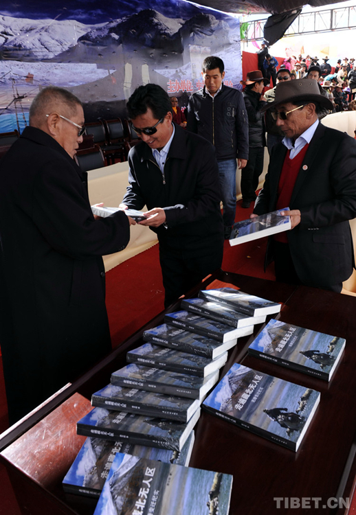 這是原西藏人大常委會(hui) 副主任、那曲地委書(shu) 記洛桑丹珍(左一)在《走遍藏北無人區》首發儀(yi) 式上,向雙湖縣幹部群眾(zhong) 贈送《走遍藏北無人區》一書(shu) 。(唐召明2013年7月27日攝)