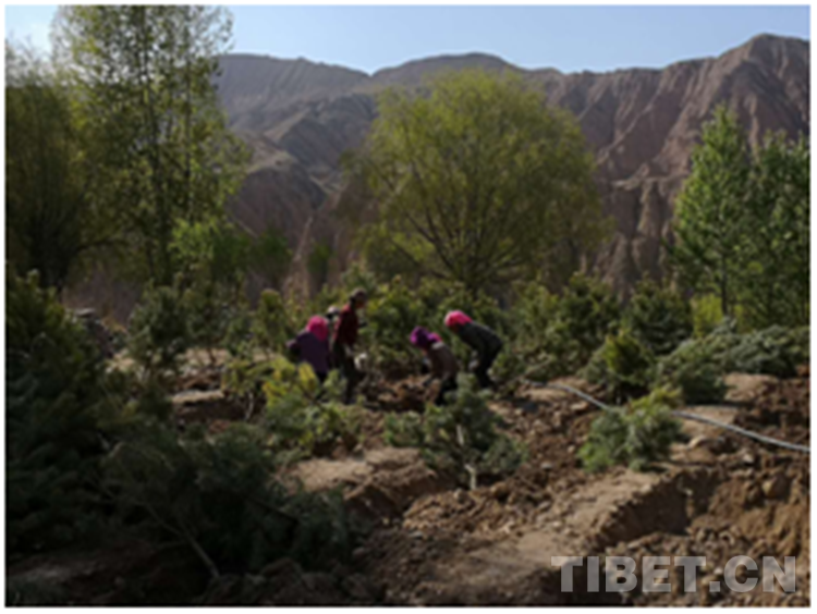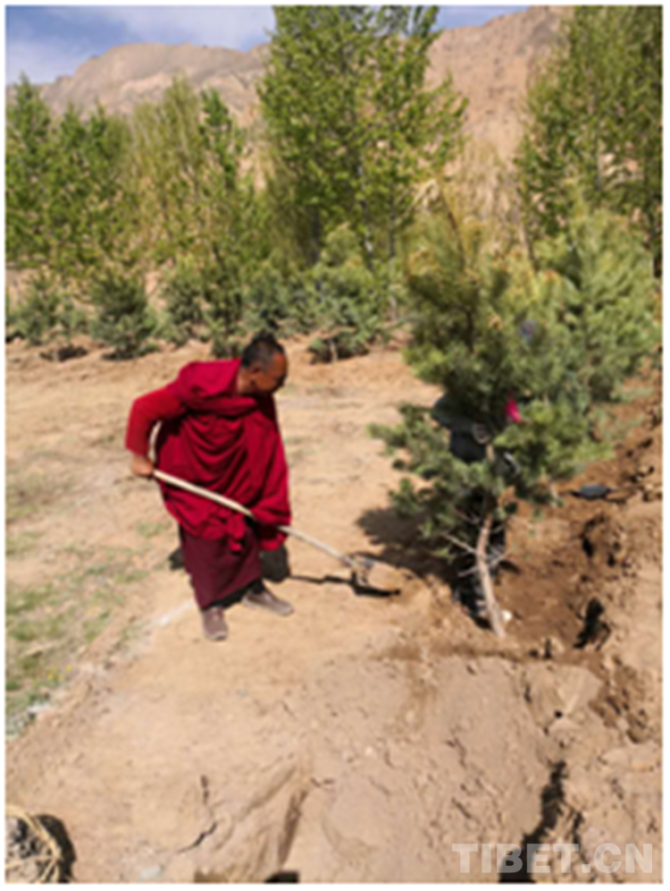 圖為(wei) 尕瑪堂敬老院負責人洛桑加措在栽種樹苗