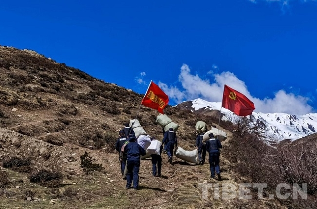 圖為(wei) 吉隆邊境管理大隊民警為(wei) 當地群眾(zhong) 背送物資 攝影:單增桑珠