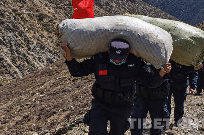 圖為(wei) 吉隆邊境管理大隊民警為(wei) 旺傑背送物資 攝影:單增桑珠