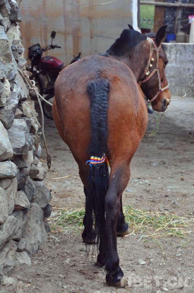 曾見過馬尾巴上紮著彩條,那是遠觀,今天才得以近距離欣賞。這匹馬整條尾巴被梳妝打扮過,從(cong) 根部的毛開始,分六七股辮成扁平狀,在尾巴中間用彩帶束紮起來,如此裝飾可見當地人對馬的熱愛。馬能靜靜地站在那裏,讓主人花那麽(me) 長時間辮尾巴,心裏可能也知道這是一件美好的事情。對馬和主人而言,雙方都是一種享受。