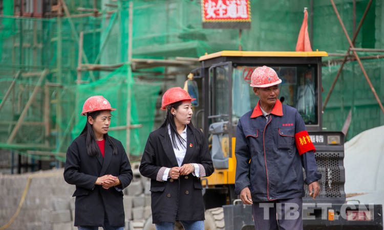 圖為(wei) 德吉卓嘎(中)在工地上 攝影:趙耀