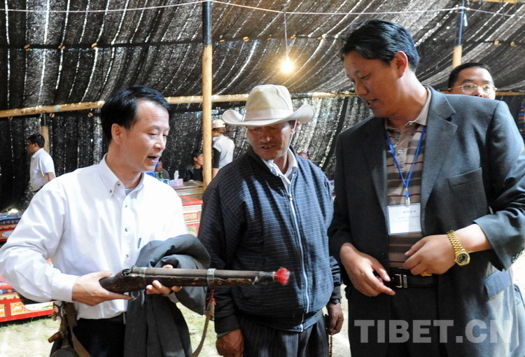 這是時任那曲縣縣長紮南(右)與(yu) 中石化首批援藏幹部李一超(左)在那曲賽馬會(hui) 的大“黑賬”裏,正在交流牧民傳(chuan) 統火槍的使用方法(唐召明2009年8月12日攝)