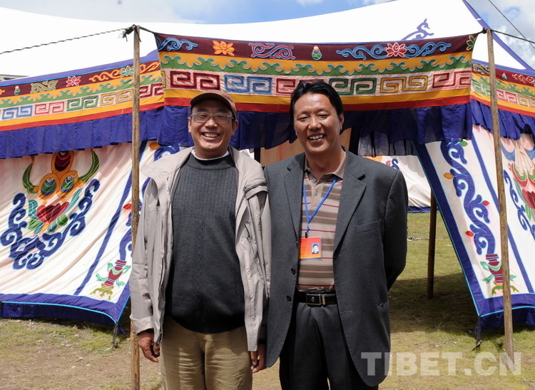 這是唐召明(左)與(yu) 時任那曲縣縣長紮南(右)在那曲賽馬會(hui) 的帳篷前合影留念(唐召明提供,2009年8月12日攝)