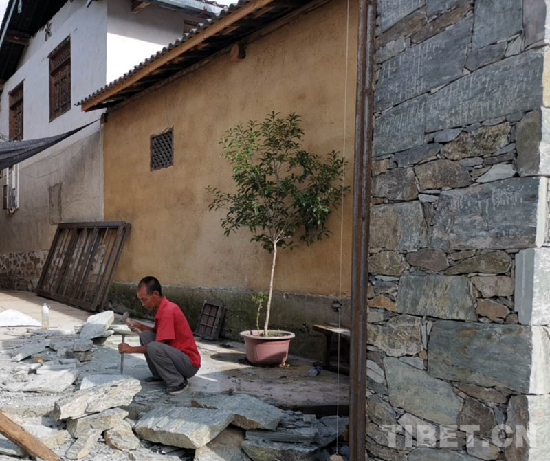 漫步村間,石板鋪就的道路縱橫交錯,與(yu) 居民房舍相連。鳥語蟬鳴,人與(yu) 自然在這裏和諧共生。遠處傳(chuan) 來石頭的敲擊聲,沿石板路而上,循聲走近,看到一位大爺在家門口敲擊著大石塊,記者便好奇地上前詢問。這位大爺告訴我們(men) ,他在修建自家的大門。
