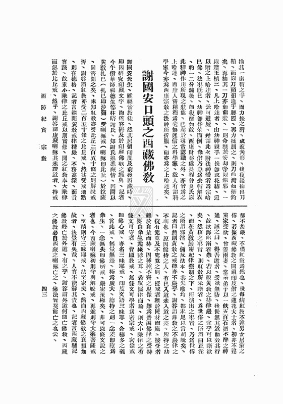 1887年,謝國安出生在今四川省甘孜縣絨壩岔。他的藏名為(wei) 多吉卓巴,後因信仰基督教,取名Paul Sherap(人稱智慧保羅,我們(men) 注意到此名帶有藏文音譯),漢名謝國安。10歲時,他離開家鄉(xiang) 進入拉薩哲蚌寺學經。不久,謝國安離開寺廟,跟隨藏商商隊去了錫金甘托克、印度大吉嶺的教會(hui) 學校學習(xi) 藏文、英文和梵文。後應孟加拉亞(ya) 洲學會(hui) 之請,到加爾各答參與(yu) 校訂《藏文大藏經·甘珠爾》。他兼通藏、英、梵三種文字,熟練地用藏、英語會(hui) 話。辛亥革命爆發後,他返回內(nei) 地,之後定居康定。此後一段時間在康定的國立師範學校任教,主持編寫(xie) 了多部教材,如《西康國語教科書(shu) 》(8冊(ce) )、《西康常識教科書(shu) 》(8冊(ce) )、《西康公民教科書(shu) 》等。這套教科書(shu) 編輯方法,係根據教育部頒“小學課程標準”及西康特殊環境,先編漢文,再用藏文譯注,對民國時期西康教育發展和推廣起到特殊的推動作用。他曾在西康舉(ju) 辦的“縣訓班”擔任藏文教員。當時著名學者李思純曾在康定見過他,印象較好,認為(wei) 他“居印度甚久,故能操英語等,現居康定,研習(xi) 藏文甚深。”1938年,著名學者柯象峰到康定一帶考察時,受到謝的熱情接待和幫助。他在日記裏對謝國安頗有讚詞,10月9日的日記中提到“午時左右,謝國安君來訪,托其購佛經數部。”幾天後謝國安即將“購得之佛經十餘(yu) 部一一為(wei) 之譯名及指出出版處”。
