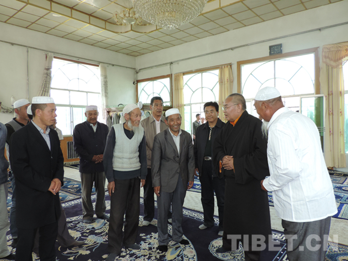圖為(wei) 十三屆全國人大常委會(hui) 委員、甘肅省人大常委會(hui) 副主任、中國佛教協會(hui) 副會(hui) 長嘉木樣•洛桑久美•圖丹卻吉尼瑪(右二)在甘南州的清真寺調研