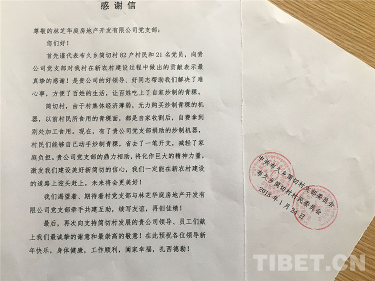 圖為(wei) 簡切村向華庭公司黨(dang) 支部表示感謝的感謝信 攝影:趙耀
