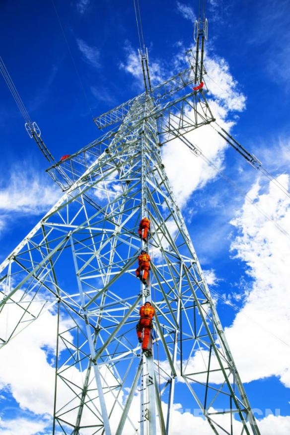 圖為(wei) 國家電網公司員工在海拔4000米上塔作業(ye)