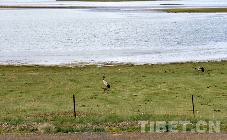 圖為(wei) 黑頸鶴在班公湖岸悠閑漫步 攝影:王媛媛