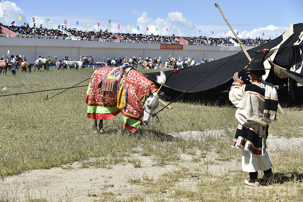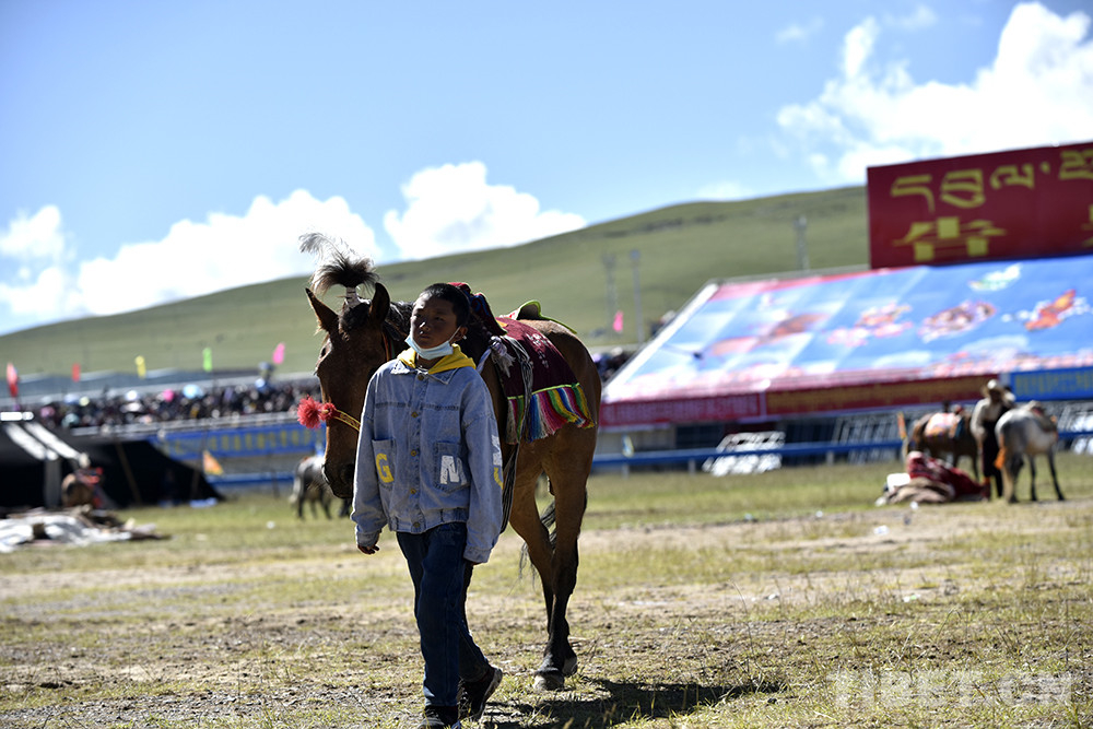 圖為(wei) 西藏自治區那曲市2020羌塘恰青格薩爾賽馬藝術節場內(nei) 速度賽馬比賽現場,一位少年牽著馬兒(er) 攝影:王媛媛
