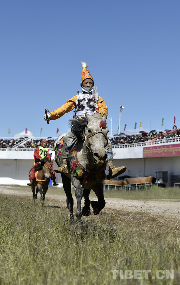 8月12日上午,西藏自治區那曲市2020羌塘恰青格薩爾賽馬藝術節的重頭戲——場內(nei) 速度賽馬比賽開始。賽道內(nei) ,沙塵飛濺;看台上,座無虛席,呐喊助威。
