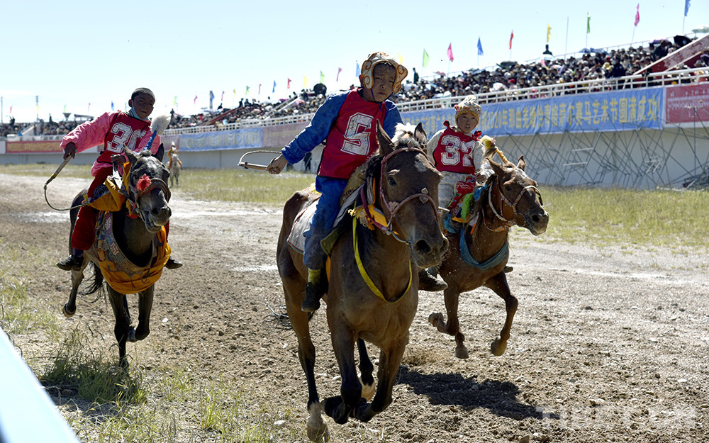 圖為(wei) 西藏自治區那曲市2020羌塘恰青格薩爾賽馬藝術節場內(nei) 速度賽馬比賽現場,少年們(men) 飛馳在馬背上 攝影:王媛媛