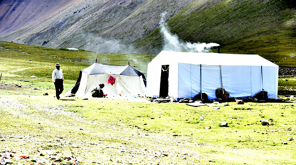 正聊著,次供的大兒(er) 子丹增多吉掀開帳篷簾子,走了出來。他的手裏提著白菜,打算去旁邊的溪水邊清洗。“靠右邊的溪水比較幹淨,平時用水也是在這兒(er) 打。左邊的溪水,遇上下雨就特別渾濁。”