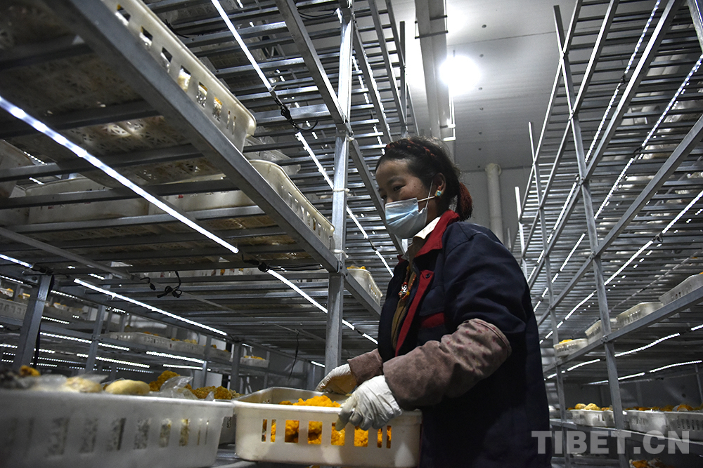 圖為(wei) 西藏自治區日喀則市珠峰一見則喜生物科技示範園區出菇棚裏,工人正在采摘金耳 攝影:王媛媛