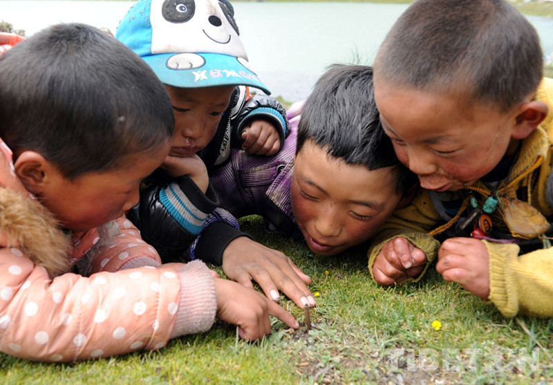 圖為(wei) 藏族兒(er) 童在觀看所找到的蟲草(唐召明2014年7月10日攝)