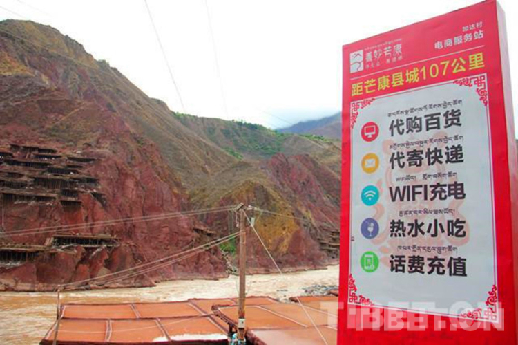 圖為(wei) 千年古鹽田邊的芒康縣農(nong) 村電商服務站廣告牌。 攝影:李元梅