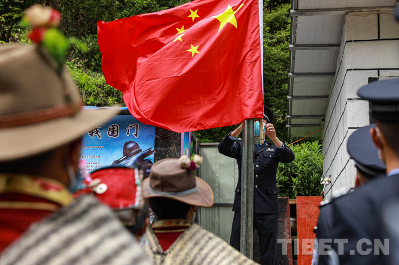 圖為(wei) 陳塘邊境派出所民警和夏爾巴群眾(zhong) 一同升國旗